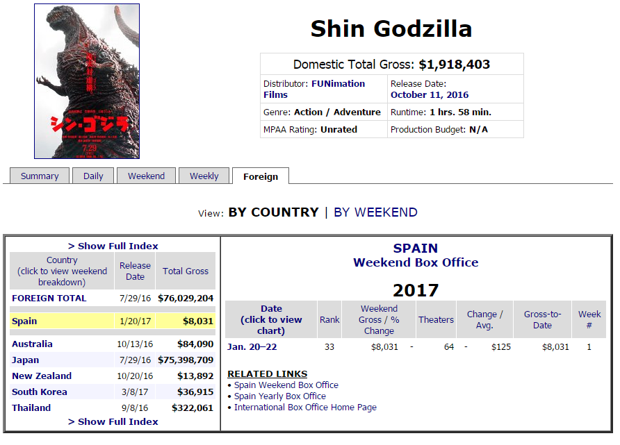 アサ芸の「シンゴジラ欧州で惨敗」記事、1月にスペインで三日間だけ限定上映した結果を大袈裟に書いただけじゃないか。しかも他のC級ホラー映画との抱き合わせ。さすがアサ芸www