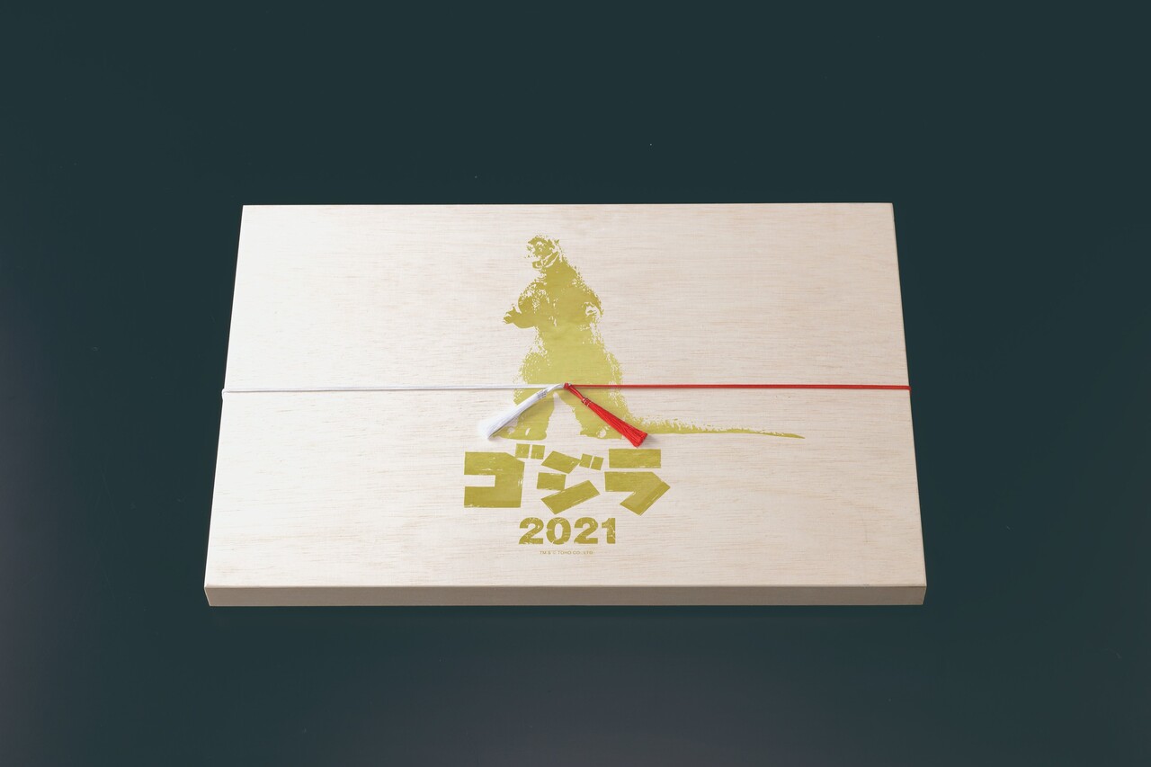 創業70年の老舗食品メーカー「山福」とのコラボレーション商品で、ゴジラの足跡型の昆布、金粉をまぶしキングギドラに見立てた数の子、メカゴジラのメタリックな機体をイメージしたクリアシートで包んだカスタード餅など、作中に登場する怪獣や名シーンを題材にしたさまざまな料理が詰め込まれている。